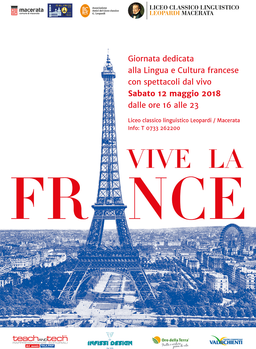 VIVE LA FRANCE si avvale anche del sostegno economico di Teach and Tech Rappresentanze editoriali, Infissi Design, Oro della Terra e Centro Commerciale Valdichienti.