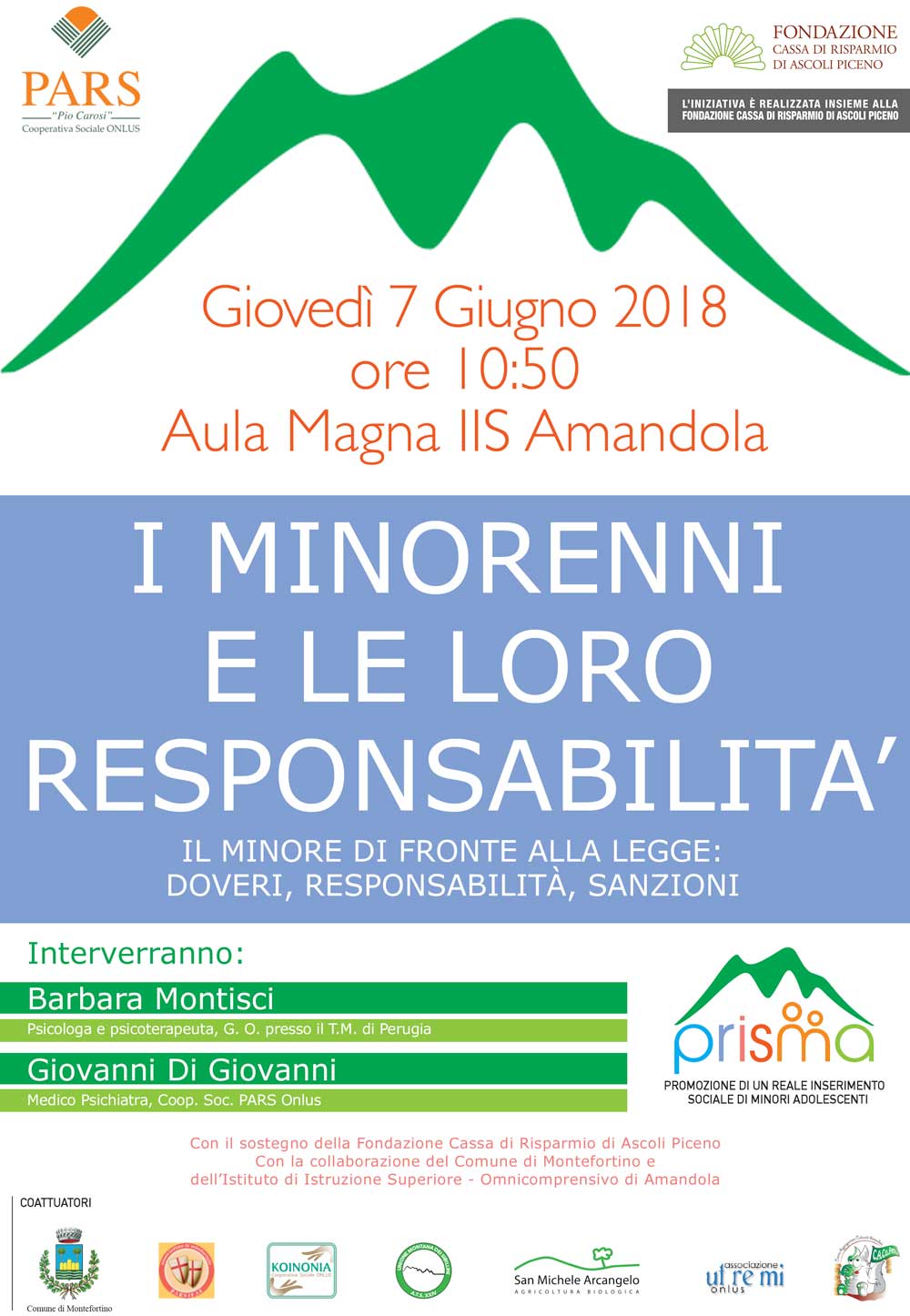 «I minorenni e le loro responsabilità» è l’incontro formativo ideato e promosso dalla cooperativa sociale Pars onlus nell’ambito del progetto Prisma, realizzato insieme alla Fondazione Cassa di Risparmio di Ascoli Piceno. L’evento si terrà giovedì 7 giugno, alle ore 10.50, all’Aula Magna dell’istituto Omnicomprensivo di Amandola, in via Carlo Baiocchi 1, ed è realizzato in collaborazione con il Comune di Montefortino e l’Istituto di Istruzione Superiore Omnicomprensivo di Amandola. Interverranno Barbara Montisci, psicologa e psicoterapeuta Giudice Onorario del Tribunale per i Minorenni di Perugia e Giovanni Di Giovanni, medico psichiatra della cooperativa Pars onlus.