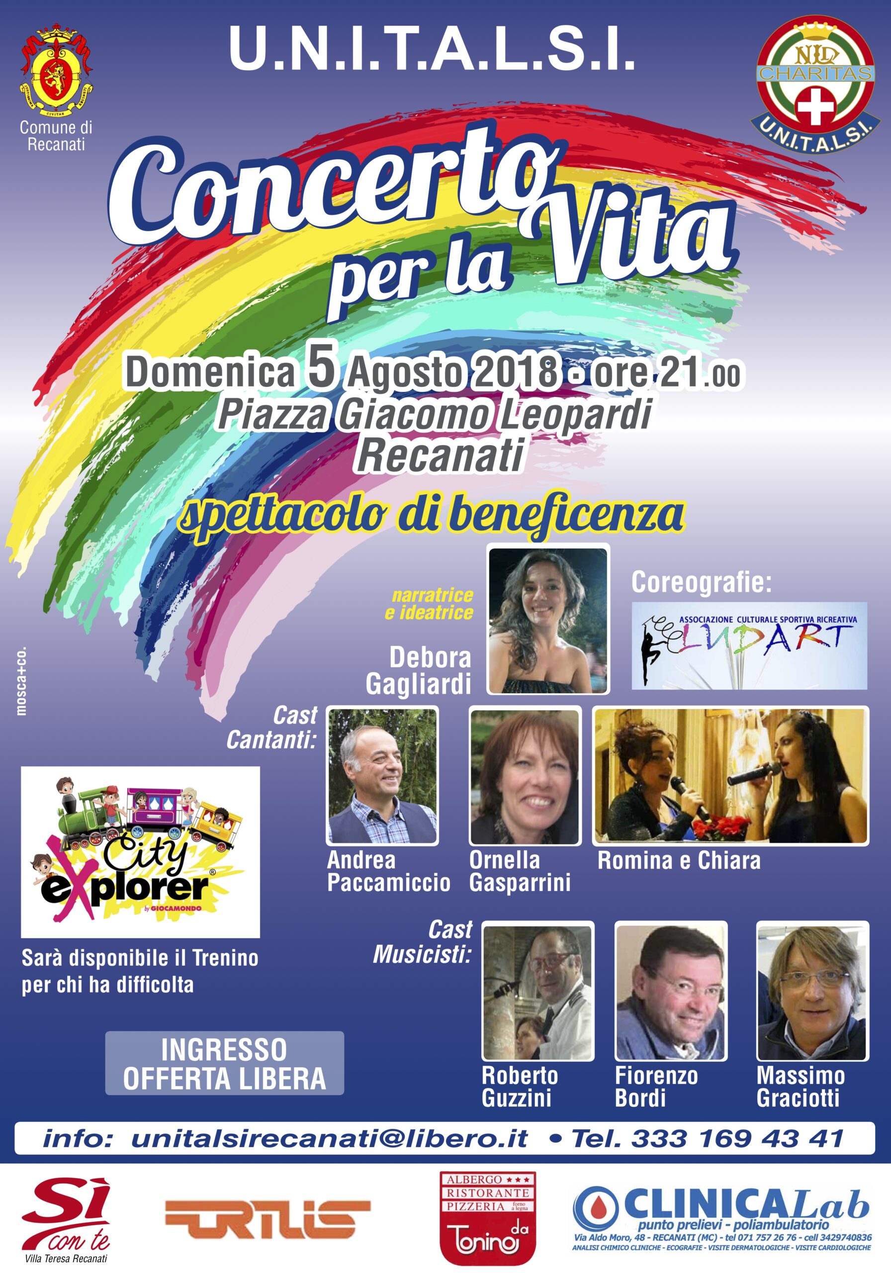 Torna l’appuntamento con il «Concerto per la vita», promosso dalla sezione recanatese dell’Unitalsi e previsto per il prossimo 5 agosto. Si tratta di un appuntamento ormai tradizionale quello che richiama in piazza Giacomo Leopardi le tante associazioni del territorio che si occupano di aiutare persone i difficoltà.