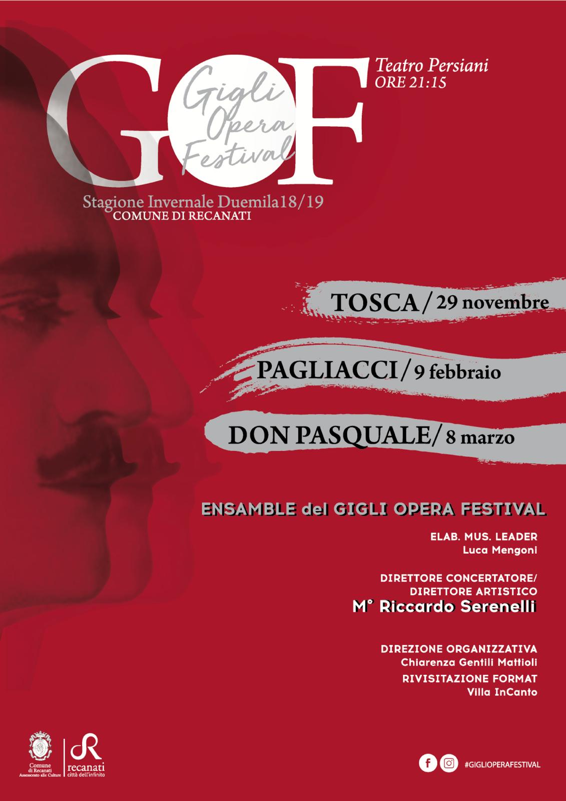 Alla vigilia dell’anniversario della morte del tenore recanatese Beniamino Gigli (avvenuta il 30 novembre 1957), il 29 novembre alle ore 21.15 al Teatro Persiani di Recanati, La Tosca aprirà il sipario del Gigli Opera Festival promosso dallo staff di Villa InCanto, condotto dal Maestro Riccardo Serenelli coadiuvato dal Direttore organizzativo Chiarenza Gentili Mattioli con il sostegno e la collaborazione del Comune di Recanati, dell’Assessorato alle Culture e della Civica Scuola di Musica “Beniamino Gigli”.