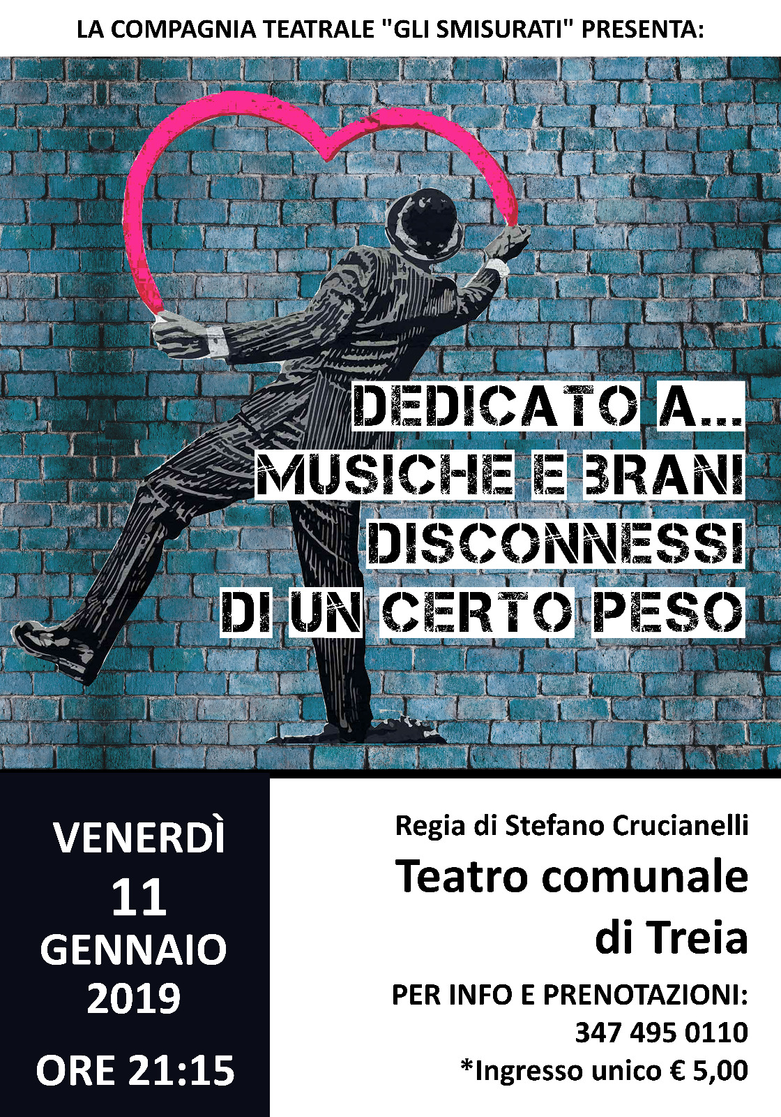 La compagnia teatrale “Gli Smisurati” porta ancora una volta sul palco del Teatro Comunale di Treia la voglia di sperimentazione che la contraddistingue. “Dedicato a… Musiche e brani disconnessi di un certo peso” è lo spettacolo che andrà in scena venerdì 11 gennaio, a partire dalle 21.15, ideato al fine di promuovere la seconda edizione della rassegna di teatro per disabili “Fuori misura, premio Giovanni Soldini”. In sé già una dedica, questa, all’insegnante e amministratore pubblico che fin dall’inizio ha sostenuto la crescita della compagnia.