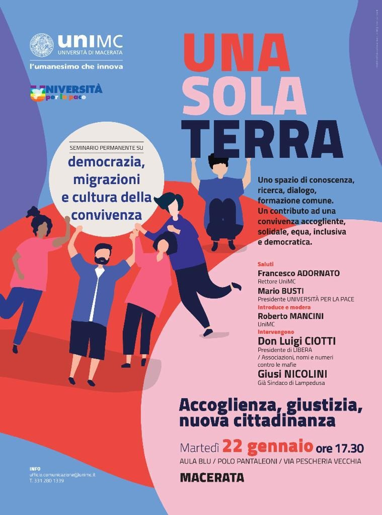 «Una sola terra» è l”iniziativa fortemente voluta dal rettore di Unimc Francesco Adornato che ha preso forma sotto la coordinazione del docente di filosofia teoretica Roberto Mancini e ha già promosso importanti momenti di confronto sui temi della convivenza.