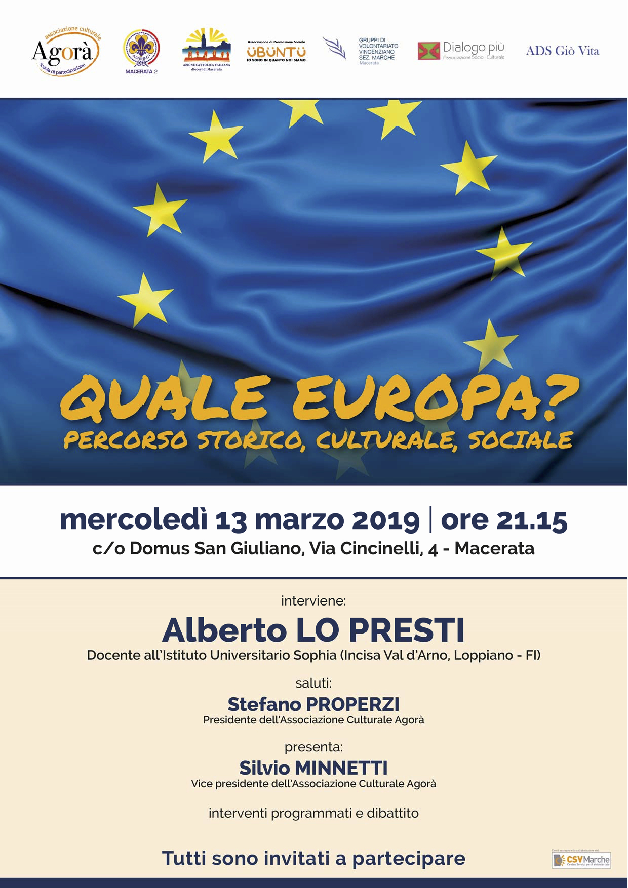 Si terrà domani, mercoledì 13 marzo alle 21.15 alla Domus San Giuliano di Macerata l’incontro pubblico organizzato da Agorà, Agesci, Azione Cattolica, Ubuntu, Gruppo Vincenziano, Dialogo più e Giò Vita sul tema: «Quale Europa? Percorso storico, culturale, sociale».
