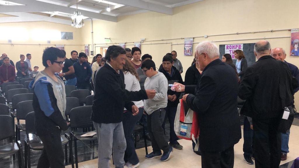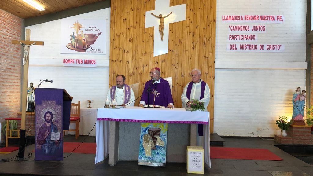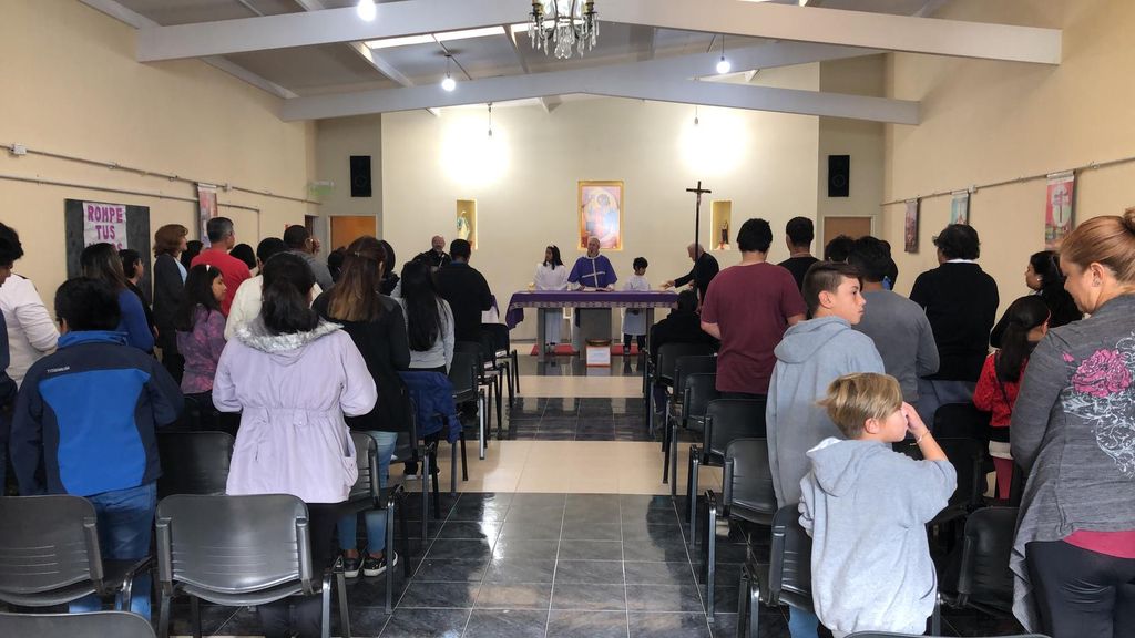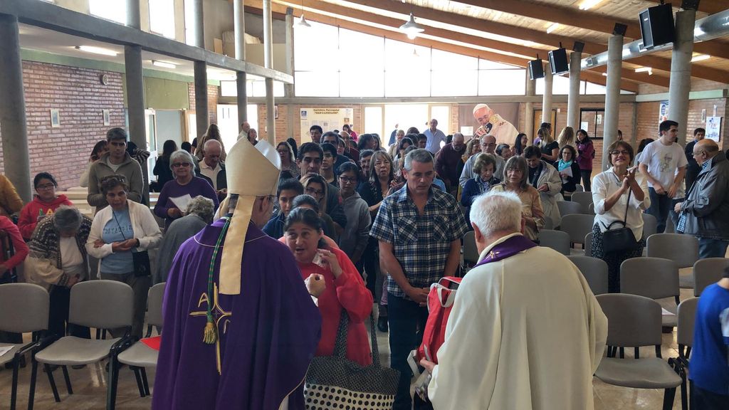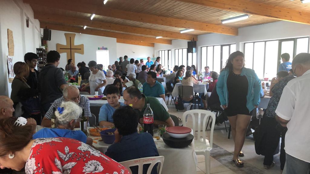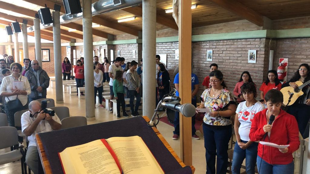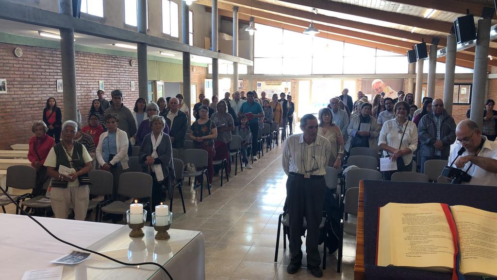 «Benvenuto padre vescovo Nazzareno, con padre Alberto e padre Andrea. Siamo molto felici di accogliervi e di condividere questi giorni con voi. Che gioia la vostra presenza nelle nostre case, condividendo la nostra vita, camminando e celebrando insieme. Una presenza che oggi è fisica, ma che è sempre stata molto vicina nonostante la distanza. Vorremmo esprimere questa gioia a parole, ma è difficile perché sempre i gesti, gli sguardi, i sorrisi, gli abbracci e ogni altro segno dicono molto di più. Sono sicura che resteranno nel vostro cuore dopo il ritorno in Italia. E così avremo realizzato il nostro desiderio. La prima parola che sento è: grazie. Grazie alla Diocesi di Macerata per l’accompagnamento costante e forte offerto alla nostra comunità, che ci ha fatto sentire parte di una sola famiglia. Grazie per aver inviato sacerdoti in questa nostra Patagonia. Pastori che hanno operato su questa terra, servendo le sue comunità e le sue famiglie, condividendone la vita per guidarle e condurle alla fede. Grazie per l’unione nella preghiera, per averci tenuto presenti nelle vostre intenzioni, per essere davvero una sola famiglia orante. Grazie per averci aiutato a crescere, per la vostra generosità espressa in tanti gesti concreti ed amorosi, che ci hanno permesso di realizzare molti sogni. A partire dalla nostra parrocchia, ogni giorno più bella e aperta a tutti; come accade delle nostre cappelle, simboli di una famiglia che cresce, che cerca di condividere l’esperienza della fede con altri fratelli. E che ogni giorno crescono nella comunione e nella spiritualità. Un esempio è stata la partecipazione dei nostri giovani alle giornate mondiali della gioventù in Brasile, in Polonia ed a Panama, quando avete accolto Jesica e Braian tra i vostri giovani di Macerata in una bella esperienza di fraternità. Anche se abbiamo fatto un lungo cammino, siamo una comunità giovane: ricordiamo ancora con tenerezza la casetta, il container e le Messe all’aria aperta, da cui ebbe inizio questo sogno di Dio e nostro. Mattone su mattone, insieme, in comunità, abbiamo costruito la famiglia che siamo oggi, un percorso in cui la vostra diocesi è stata una compagna fedele nel pieno significato del termine. Per questo “compagnia” è un’altra parola importante. Oggi continuiamo a camminare, con i piedi a terra e lo sguardo volto al cielo. Seguendo l’esempio di vita del nostro patrono san Cayetano, desiderando imitare il suo stile di vita: umile, semplice, orante, attento ai più bisognosi, fiducioso nella Provvidenza e sempre vicino all’Eucaristia. Impegnandoci al massimo per vincere le difficoltà, costruire comunità, inseguire i sogni, aprire le porte e donare a tutti l’esperienza di un Dio che cammina con noi. Che bello condividere tutto questo, sentirci fratelli, poter celebrare insieme l’Eucaristia. “Fratelli” è un’altra parola che deve aggiungersi alla festa ed anche “celebrare” non può mancare. Così giungiamo all’ultima parola che è doppia “Mamma Maria”, la Sua presenza non può certo mancare. In Lei confidiamo, sapendo che se ci tiene per mano seguiremo Gesù. È lei che ci insegna a camminare: famiglie, bambini, giovani, nonni, papà e mamme, tutti uniti. Che tenendola per mano ci sentiamo sempre uniti nonostante la distanza, tutti uniti a Suo figlio Gesù».