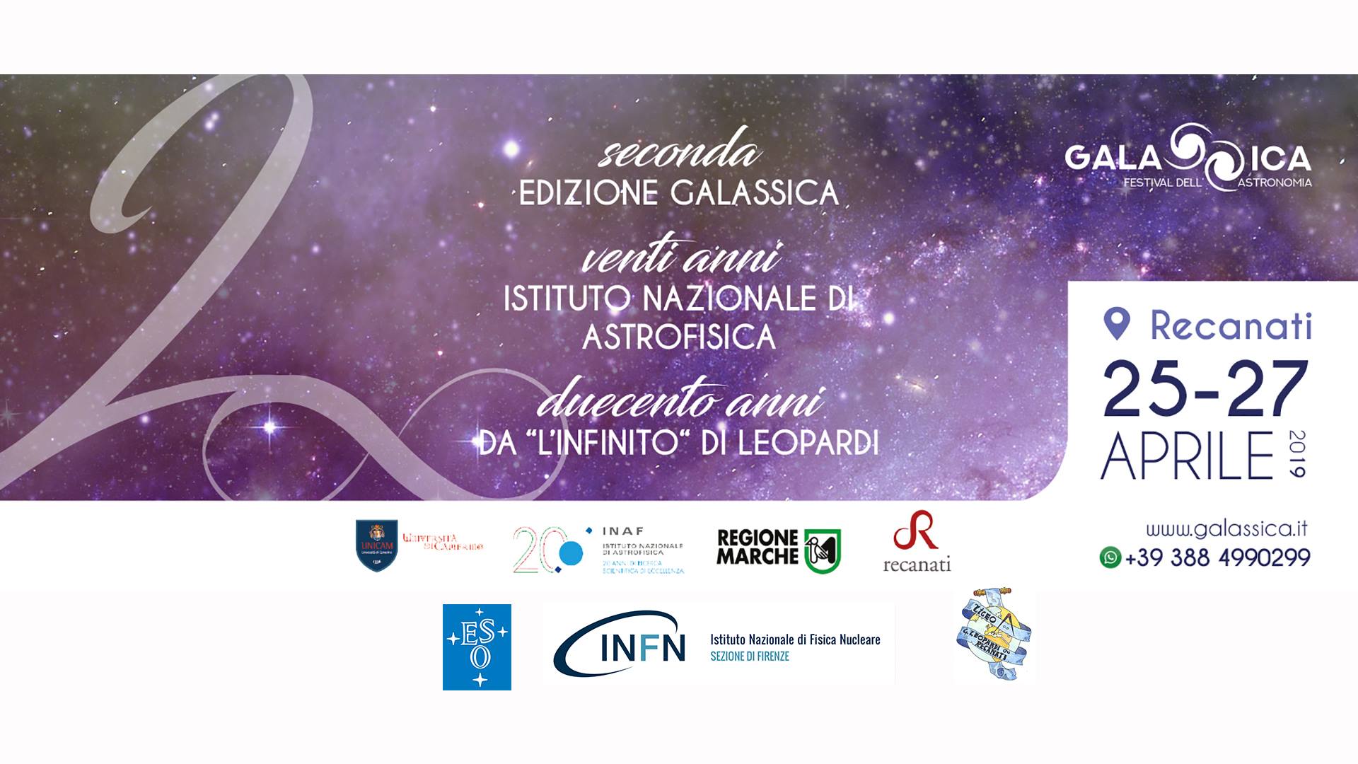 Si inaugura il 25 Aprile alle ore 15 nella Sala degli Stemmi del Comune di Recanati, GALASSICA, il festival nazionale di Astronomia in programma dal 25 al 27 Aprile a Recanati. L’inaugurazione del festival coinciderà con l’apertura della mostra fotografica “Da Zero ad Infinito”, che raccoglie emozionanti scatti dell’Universo conosciuto e la matematica che ne descrive la straordinaria bellezza.