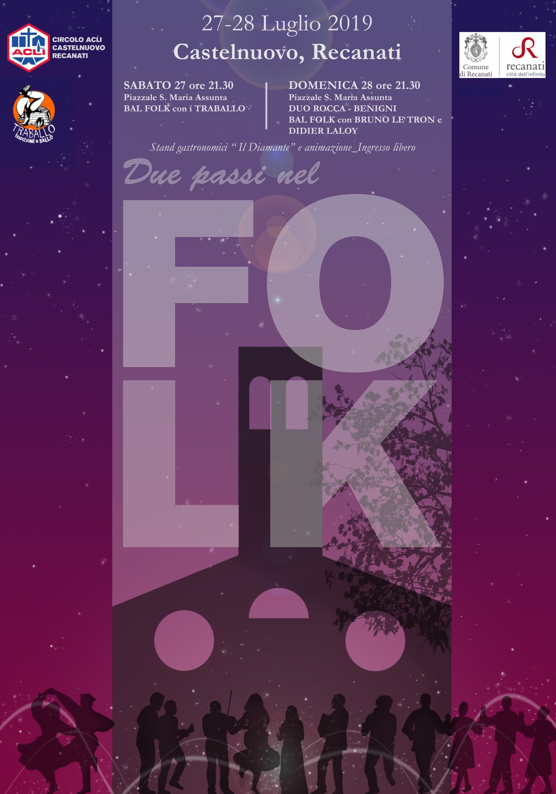 Il Festival dedicato al Folk che si terrà il 27 e 28 luglio – promosso da Acli Castelnuovo e Traballo con il patrocinio del Comune di Recanati, Assessorato alle Culture -, accoglierà ospiti di caratura internazionale protagonisti della scena musicale europea e amanti delle eccellenze marchigiane di cui il rione è scrigno. Un programma ricco di contenuti e di emozioni che accompagnerà il pubblico alla scoperta della musica folk dal suo ascolto alla sua composizione.