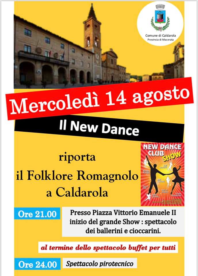 Un nuovo gemellaggio di colori e sapori per animare ancora una volta la vigilia di Ferragosto. E quello che sta organizzando il comune di Caldarola in collaborazione con la Proloco e il gruppo di ballo New Dance Club di Forlì che, dal terremoto delle 2016, ha instaurato un forte rapporto di amicizia e solidarietà con il territorio e la popolazione caldarolese. Un nuovo appuntamento con la musica, i balli folkloristici romagnoli e il buon cibo questa volta però nella riconquistata piazza Vittorio Emanuele II, non più zona rossa. A partire dalle ore 21 di mercoledì 14 agosto il gruppo di ballo New Dance Club di Forlì animerà la serata un grande Show, uno spettacolo di ballerini e cioccarini che farà vivere momenti di folklore romagnolo a tutte le persone presenti. Al termine dello spettacolo ci sarà un buffet per tutti e poi, a mezzanotte, i suggestivi fuochi d’artificio. Tra le varie feste che caratterizzano il territorio a seguire, il 16 agosto, a Bistocco tradizionale festa di San Rocco.