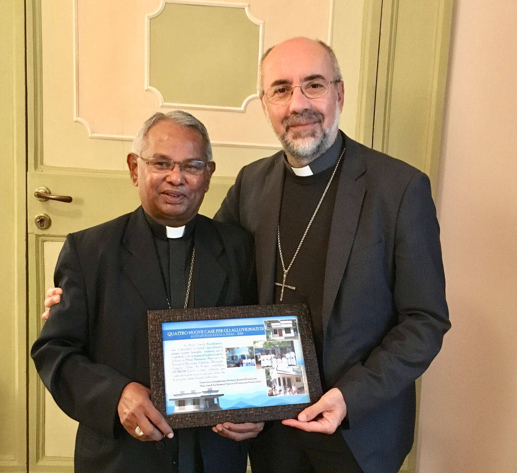 Con tale cifra sono state realizzate 4 case a favore di famiglie che avevano perso l’abitazione. La foto all’inizio dell’articolo mostra l’incontro, svoltosi in occasione della celebrazione di apertura dell’anno pastorale, durante il quale il vescovo Karikkassery, esprimendo la gratitudine della sua diocesi, ha donato a monsignor Nazzareno Marconi una targa a ricordo della donazione.