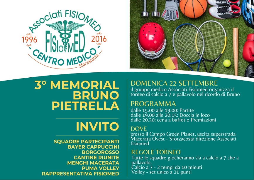 Al centro sportivo “Green Planet” di Tolentino andrà in scena domenica la 3° edizione del Memorial “Bruno Pietrella” rinviata la scorsa settimana per il maltempo. Ad organizzarlo come sempre il Centro Medico Associati Fisiomed che così vuol ricordare una figura importante, come fu l’ex amministratore del gruppo diventato ormai un riferimento nel ramo della sanità privata. Sarà anche un’occasione per divertirsi facendo salutare sport, nonché per celebrare i successi e le soddisfazioni ottenute nell’ultima annata agonistica dalle varie squadre sponsorizzate Fisiomed.