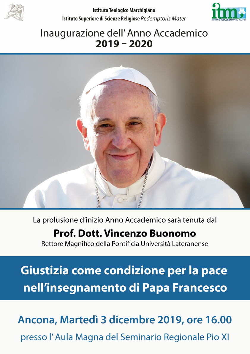 Il prossimo 3 dicembre 2019, alle ore 16.00, presso l’aula magna del Seminario Regionale Pio XI di Ancona, si terrà l’inaugurazione dell’anno accademico 2019/2020 dell’Istituto Teologico Marchigiano. Si tratta della ricorrenza più solenne della vita dell’Istituto, che vedrà come ospite il Rettore Magnifico della Pontificia Università Lateranense, il Prof. Dott. Vincenzo Buonomo. Il Rettore, esperto di diritto internazionale, proporrà una prolusione dal titolo «Giustizia come condizione per la pace nell’insegnamento di Papa Francesco».