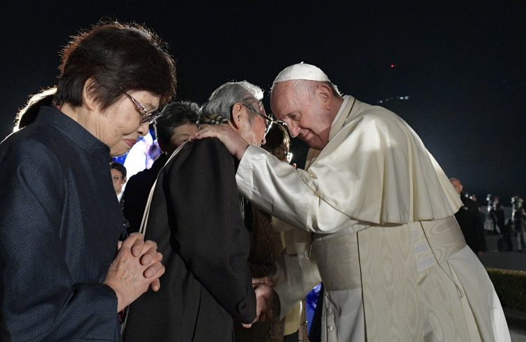 “Quando fummo bombardati avevo 14 anni ed ero uno studente di terza media”. A raccontare la sua esperienza al Papa è stato un sopravvissuto, Yoshiko Kajimoto. “All’epoca mi trovavo a 2,3 chilometri al nord dell’epicentro, e lavoravo nella produzione di parti per le eliche degli aeroplani”, ha esordito Yoshiko: “Nel momento in cui una luce blu ha attraversato la finestra, ho subito pensato a una bomba. Poi la fabbrica è rumorosamente crollata ed io sono svenuto. Sono rinvenuto tra le grida dei miei compagni, ma era buio e non riuscivo a muovermi perché ero sepolto sotto le macerie. Mi sono reso allora conto che un’amica era sepolta sotto di me, quindi l’ho chiamata per vedere se era viva. Ho provato a scappare, ma avevo il piede bloccato da un legno. Quando finalmente sono riuscito a liberarmi, il mio stinco era ferito e sanguinavo abbondantemente. Quando sono uscito, ho visto che tutti gli edifici circostanti erano stati distrutti. Era buio come se fosse già sera e puzzava come di pesce marcio. Presto nel quartiere scoppiò un incendio e i compagni che non potevano camminare furono evacuati su delle barelle. Io stesso ho aiutato portandone una. Lungo la strada, c’erano persone che camminavano fianco a fianco come fantasmi; persone il cui corpo era così bruciato che non riuscivo a differenziarli tra uomini e donne, i capelli dritti, i volti gonfi, le labbra pendenti, con entrambe le mani tese e con la pelle bruciata che penzolava”. “Nessuno in questo mondo può immaginare una simile scena infernale”, ha commentato Kajimoto: “Nei giorni seguenti i cadaveri iniziarono a marcire e un fumo bianco avvolgeva tutto: Hiroshima era diventata un forno crematorio. Per molto tempo non sono riuscito a rimuovere il cattivo odore dal mio corpo e dai miei vestiti. Tre giorni dopo, sulla strada di casa, ho incontrato per caso mio padre. Mi aveva cercato per tre giorni, e supponeva che fossi morto. Ero realmente felice. Tuttavia, mio padre era stato esposto alle radiazioni e dopo un anno e mezzo cominciò a vomitare sangue e morì. Quando arrivai a casa avevo la febbre alta e mi sanguinavano molto le gengive. Mia madre è morta a causa degli effetti della bomba atomica dopo averne sofferto per venti anni. Due terzi del mio stomaco mi sono stati rimossi a causa del cancro nel 1999. La maggior parte dei miei amici sono morti a causa del cancro. Inoltre, a causa delle radiazioni, 74 anni dopo soffro di leucemia e cancro. Lavoro duro per testimoniare che non dobbiamo mai più usare tali terribili bombe atomiche né permettere che nessuno al mondo debba sopportare tale sofferenza”.