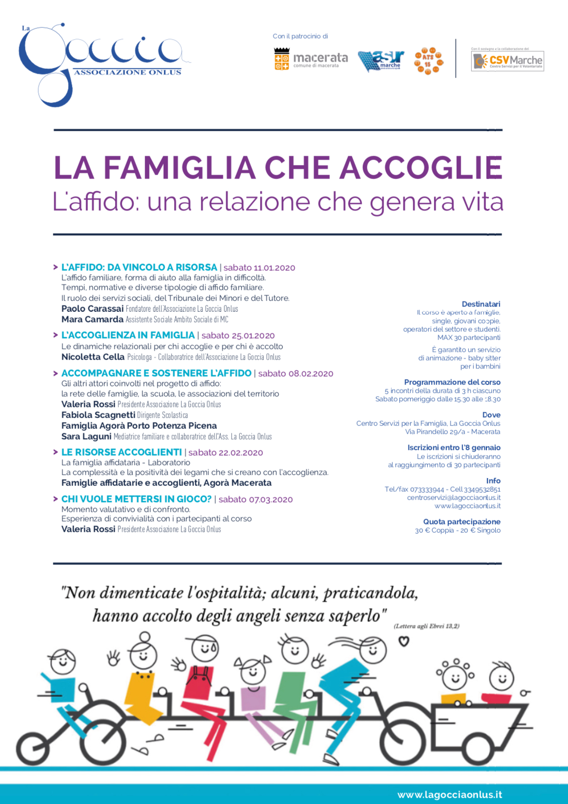 In questa ottica di apertura, accoglienza e dono reciprocol’associazione La Goccia propone un corso di formazione aperto alle famiglie, ai single e a chi fosse interessato ad approfondire l’accoglienza familiare, dal titolo “La famiglia che accoglie. L’affido: una relazione che genera vita”. Il percorso, utilizzando modalità nuove, vuole offrire e condividere la propria esperienza di informazione, formazione e preparazione per coloro che intendono aprirsi all’altro.