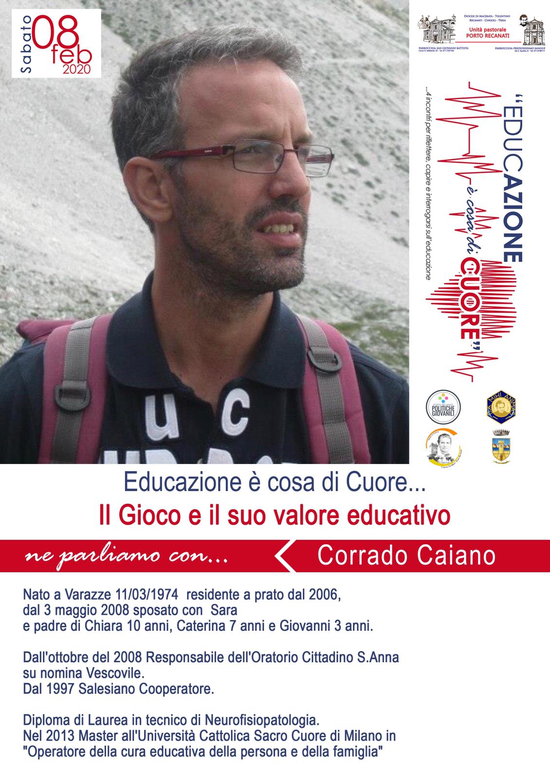È Corrado Caiano, direttore dell’Oratorio Sant’Anna di Prato, l’ospite e relatore del primo appuntamento del ciclo di incontri «Educazione è cosa di cuore» in programma sabato 8 febbraio, alle ore 17.30, presso la Pinacoteca comunale al Castello Svevo di Porto Recanati. Caiano, salesiano cooperatore dal 1997 ed ex-allievo di don Bosco, ha nel curriculum un master in “Operatore della cura educativa della persona e della famiglia” conseguito presso l’Università Cattolica del Sacro Cuore di Milano: tema dell’incontro sarà «Il gioco e il suo valore educativo».