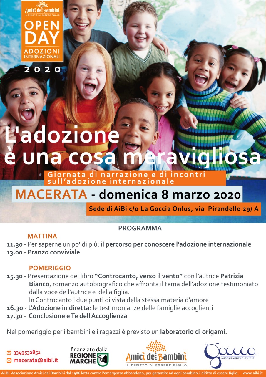 Da queste due ricerche di amore nasce l’adozione. Due percorsi si intersecano e danno vita ad un sentiero nuovo, complesso, delicato e tutto in costruzione, ma un percorso meraviglioso. L’Associazione AiBi, Amici dei Bambini, che ha uno Sportello a Macerata presso l’Associazione La Goccia Onlus, da oltre trent’anni si impegna ad accompagnare le famiglie all’incontro con i loro figli. In questa ottica, con il patrocinio della Regione Marche è nato: l’adozione è una cosa meravigliosa, una serie di eventi per sensibilizzare e promuovere l’Adozione Internazionale. Per chi si affaccia a questa realtà o anche per chi vuole semplicemente informarsi sull’Adozione Internazionale domenica 8 marzo ci sarà un Open Day, per incontrarsi e approfondire ascoltando le testimonianze di genitori adottivi e la presentazione del libro “Controcanto verso il vento” con l’autrice, Patrizia Bianco, che affronta il tema dell’adozione in un duetto di voci tra lei e sua figlia.