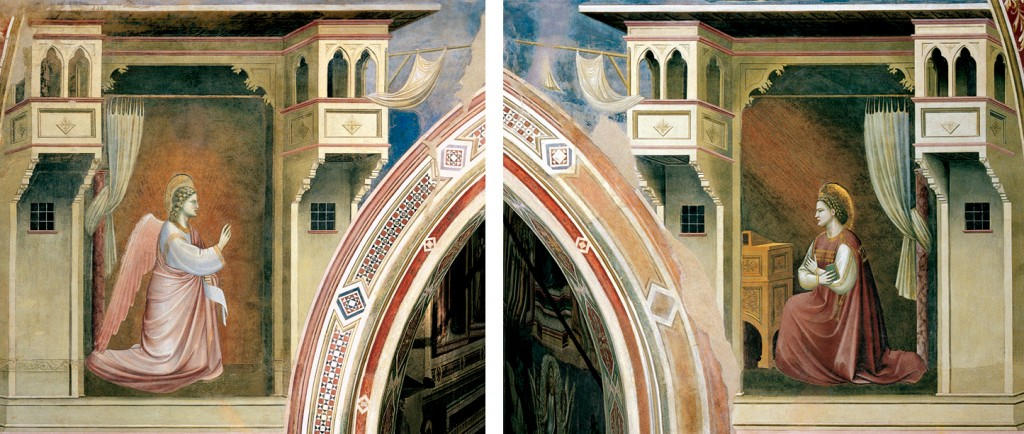 Tra le prime e più famose opere che rappresentano l’Annunciazione, proviamo a portarne qualcuna alla mente: l’affresco di Giotto nella Cappella degli Scrovegni, che fa da sfondo al titolo di questo articolo (Padova, 1305 ca); l’olio su tavola di Simone Martini (Firenze, Uffizi, 1333); l’Annunciazione del Beato Angelico nel Convento di San Marco (Firenze, 1440 ca), quella di Leonardo (Uffizi, 1475 ca), e il Barocci a Loreto, il Lotto qui a Recanati, e via via sino ai nostri giorni.