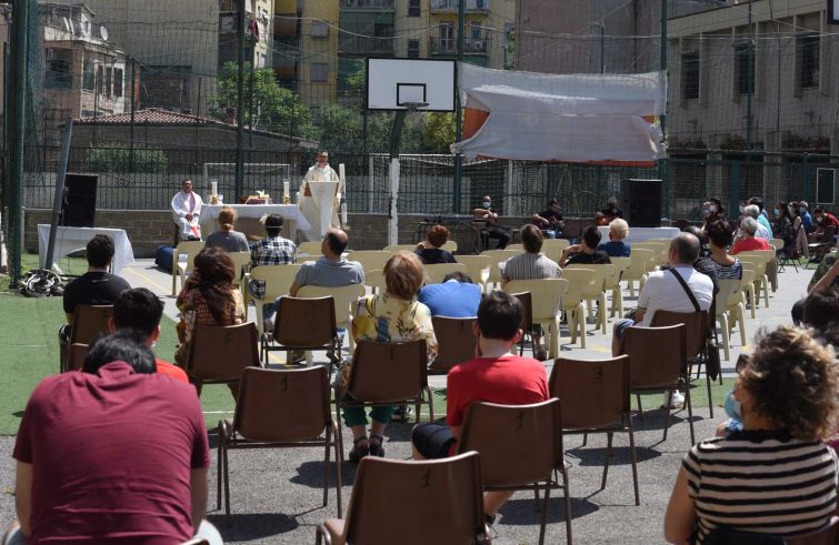 Prima messa domenicale con i fedeli, ieri, dopo stop alle celebrazioni eucaristiche per evitare il contagio del coronavirus. A Roma, diverse parrocchie hanno preferito riprendere i riti, celebrando le Messe all’aperto, dalla parrocchia di Santa Giulia Billiart a quella di San Tommaso Moro.