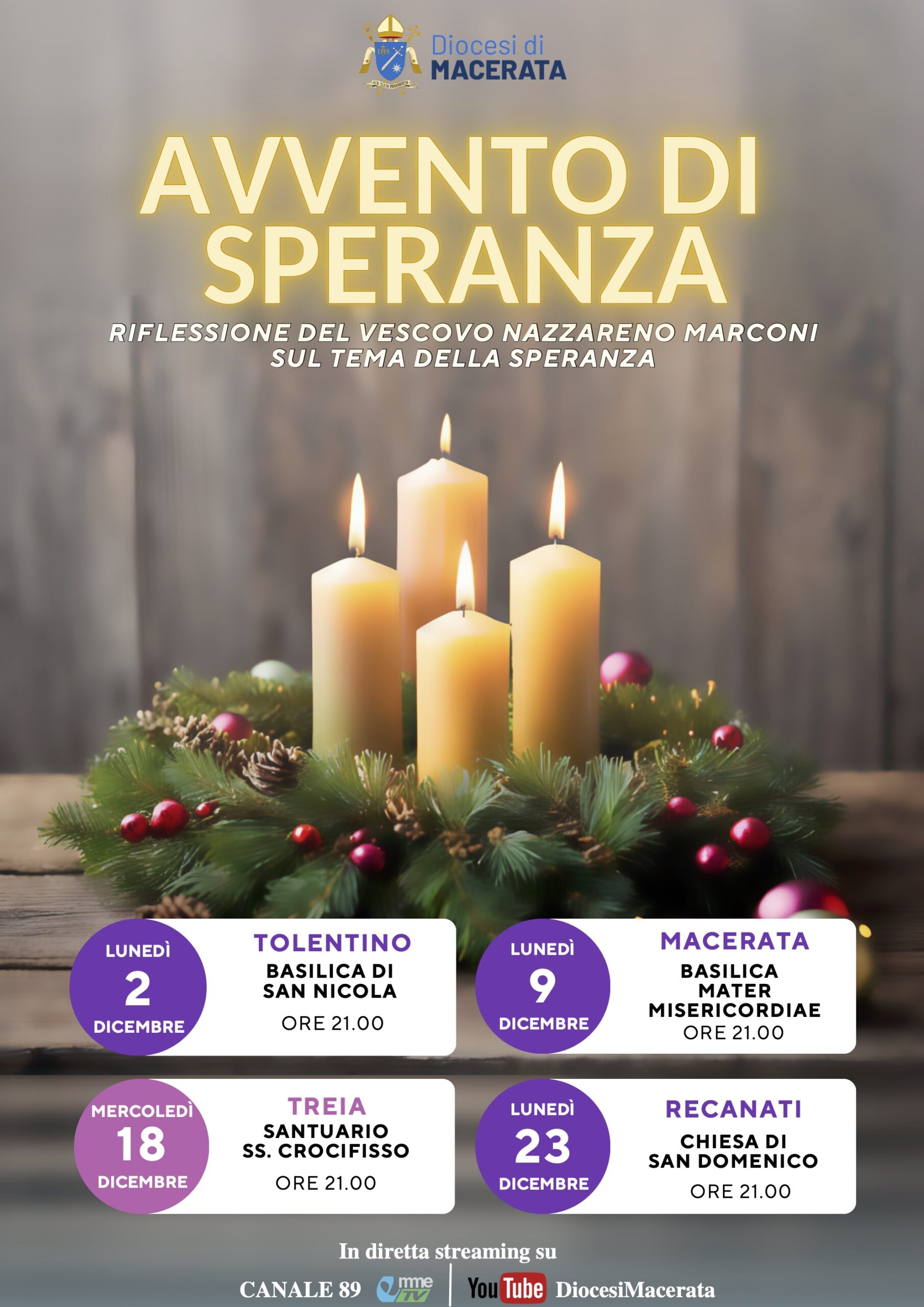 Tutti gli incontri saranno trasmessi in diretta streaming anche su EmmeTv, canale 89, e sulla pagina YouTube della Diocesi di Macerata.