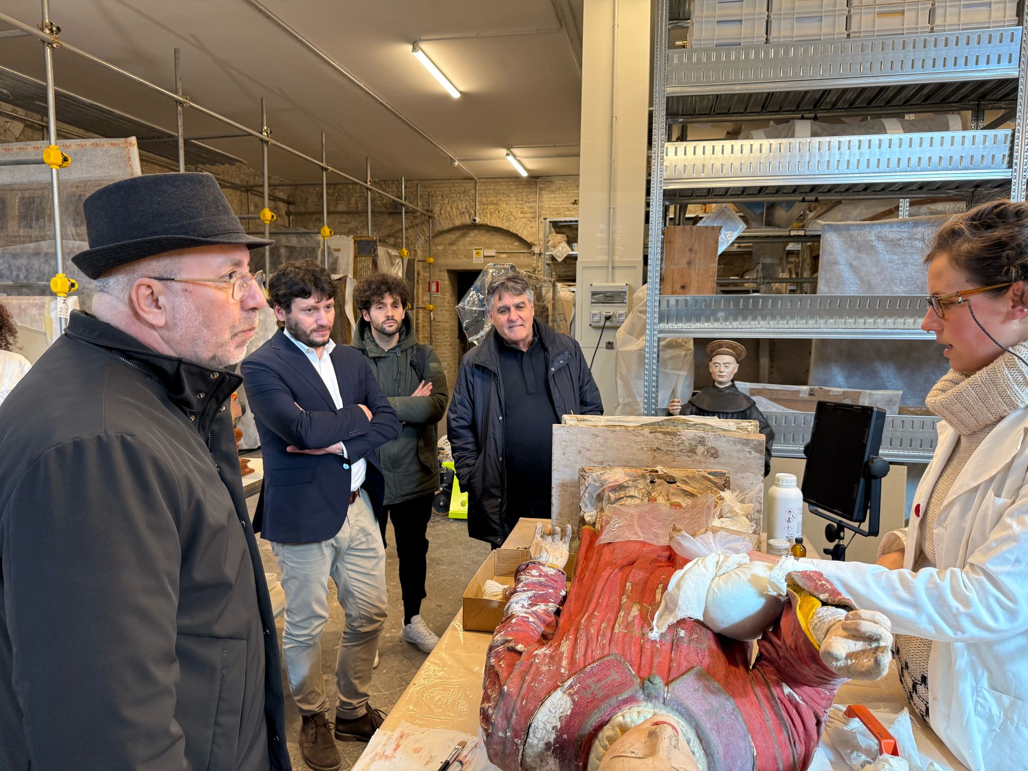 Il vescovo di Macerata mons. Nazzareno Marconi ha fatto visita ai laboratori di restauro di Montecassiano e Ancona per portare il proprio saluto ai professionisti presenti e constatare lo stato di avanzamento dei lavori.