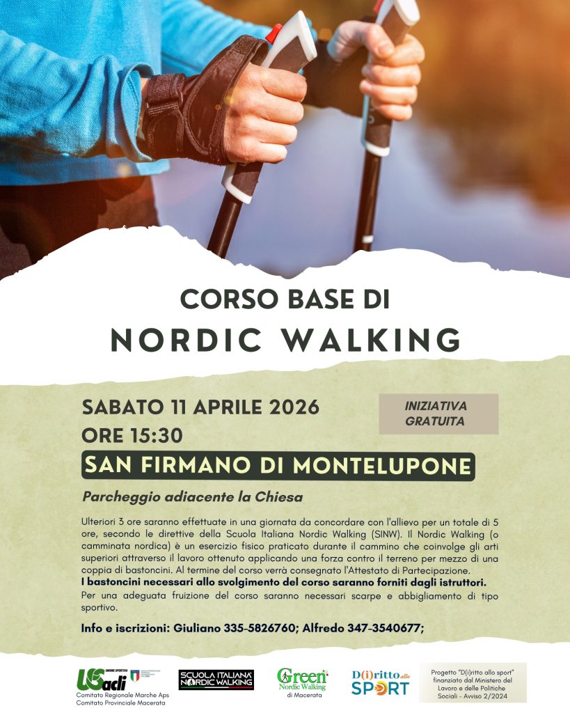 Un’opportunità per avvicinarsi allo sport e al benessere. Sabato 11 aprile a San Firmano di Montelupone si svolgerà un corso base gratuito di Nordic Walking.