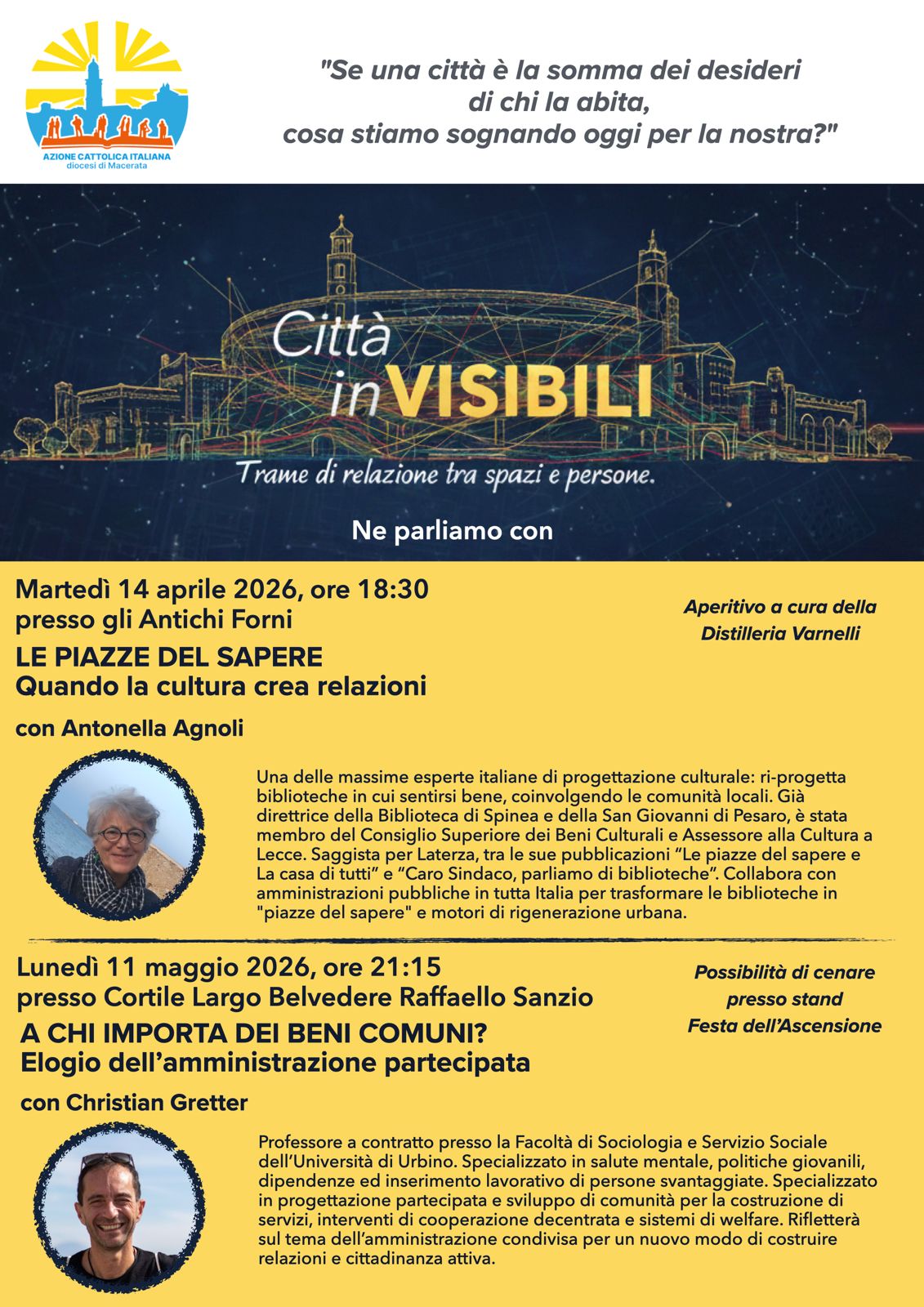 “Città inVISIBILI” si propone come un invito aperto a tutta la cittadinanza, per riscoprire Macerata non solo come spazio fisico, ma come una rete viva di relazioni, esperienze e comunità.