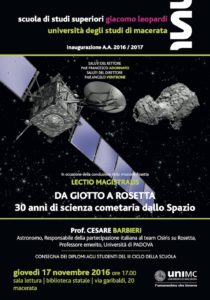 Inaugurazione dell’anno accademico 2016/2017 per la Scuola di Studi Superiori Giacomo Leopardi dell’Università di Macerata con un ospite davvero eccezionale: Cesare Barbieri, astronomo di fama internazionale tra i protagonisti della missione “Rosetta”. Per informazioni è possibile visitare il sito Scuolastudisuperiori.unimc.it.