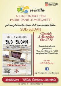 Ti terrà venerdì 3 novembre 2017 alle ore 21.15 presso l’Auditorium dell’Istituto Salesiano di Macerata, in via Dante 4, l’incontro-testimonianza con Padre Daniele Moschetti, organizzato dall’M.G.S. Ser.Mi.G.O. Don Ennio Borgogna. Il missionario comboniano presenterà il suo ultimo libro intitolato «Sud Sudan: il lungo e sofferto cammino verso pace, giustizia e dignità» (Edizioni Creativa/Dissensi). Il volume, la […]