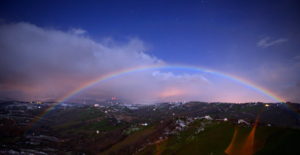 «A occhio nudo, solo una linea curva chiara, dopo approfondito esame fotografico, ecco apparire l’arcobaleno notturno». Così commenta Mario Lambertucci le spettacolari immagini inviate a EmmeTv scattate da Colmurano in direzione Monte D’Aria alle ore 22 di questa sera.