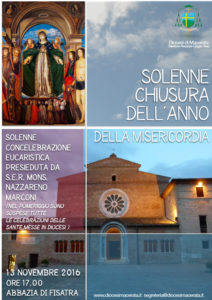 Iniziato lo scorso 13 dicembre, si chiuderà solennemente domenica 13 novembre, all’Abbadia di Fiastra, l’Anno della Misericordia. L’appuntamento è alle ore 17, quando il vescovo Nazzareno Marconi presiederà l’Eucaristia: di conseguenza, data l’importanza dell’evento a cui tutta la comunità diocesana è chiamata a convenire, nel pomeriggio tutte le Sante Messe in diocesi saranno sospese.