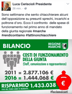 A proposito di «sprechi, incarichi, poltrone d’oro», il governatore delle Marche, Luca Ceriscioli, risponde pubblicamente con un post pubblicato oggi stesso sul social network Facebook, che recita in modo lapidario: «Sono settimane che sento chiacchierare alcuni dell’opposizione su presunti sprechi, incarichi e poltrone d’oro. Ecco il confronto delle spese di funzionamento nel primo anno di mandato […]