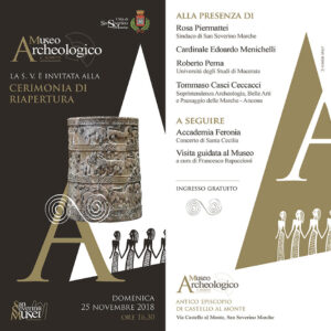 Domenica 25 novembre, alle ore 16.30, la città di San Severino Marche assisterà, alla presenza del sindaco, Rosa Piermattei, e del cardinale Edoardo Menichelli, alla cerimonia di riapertura del museo archeologico “Giuseppe Moretti” di Castello al Monte, chiuso a seguito delle scosse di terremoto di due anni fa. Interverranno alla cerimonia il professor Roberto Perna […]