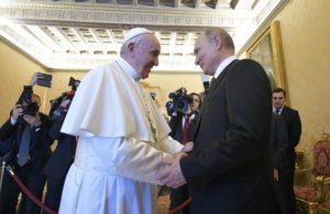 di M. Michela Nicolais È durata quasi un’ora l’udienza concessa dal Papa al presidente della Federazione Russa, Vladimir Putin. Tra i temi del colloqui, ha riferito il direttore “ad interim” della Sala Stampa della Santa Sede, Alessandro Gisotti,  anche la “questione ecologica” e “alcune tematiche dell’attualità internazionale, con particolare riferimento alla Siria, all’Ucraina e al Venezuela”. Firmato un protocollo […]